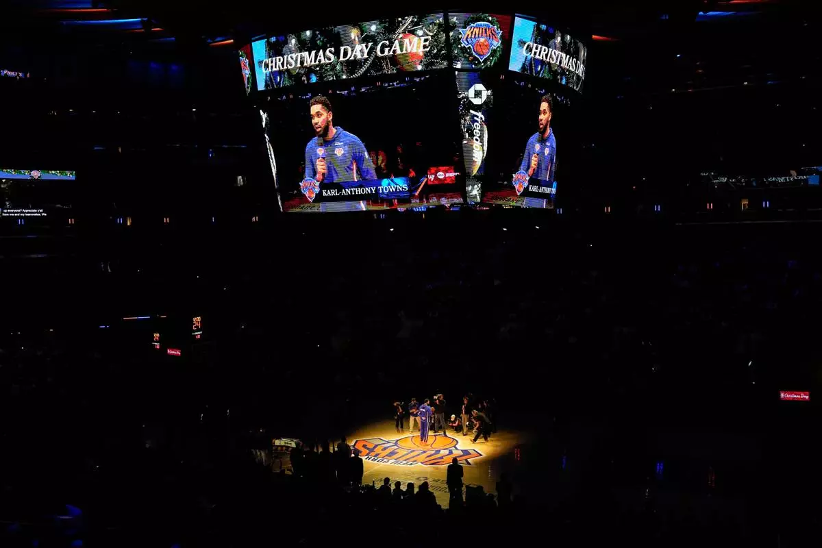 New York Knicks center Karl-Anthony Towns (32) speaks before an NBA basketball game between the New York Knicks and the Cleveland Cavaliers, Thursday, Dec. 25, 2025, in New York. (AP Photo/Yuki Iwamura)