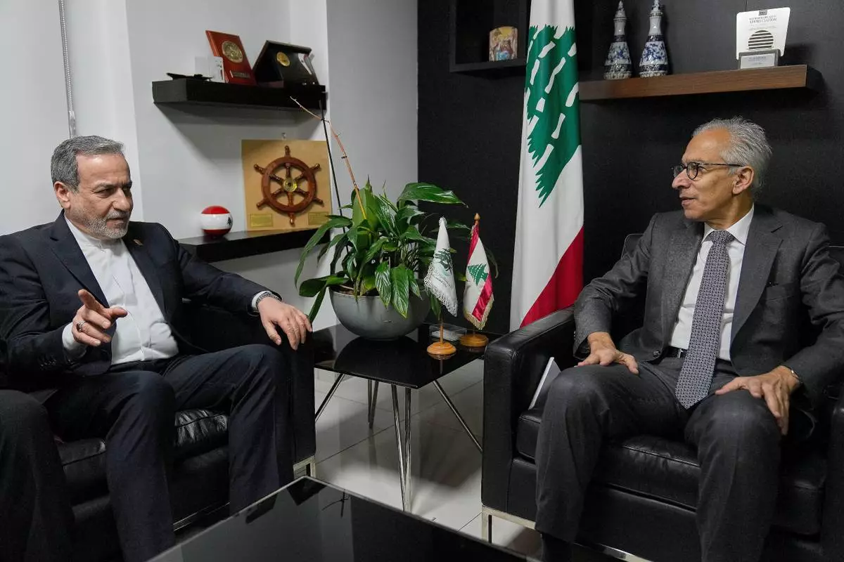 Iranian Foreign Minister Abbas Araghchi, left, meets with Amer Bisat, the Lebanese minister of Economy and Trade, in Beirut, Lebanon, Tuesday, Jan. 8, 2026. (AP Photo/Hussein Malla)