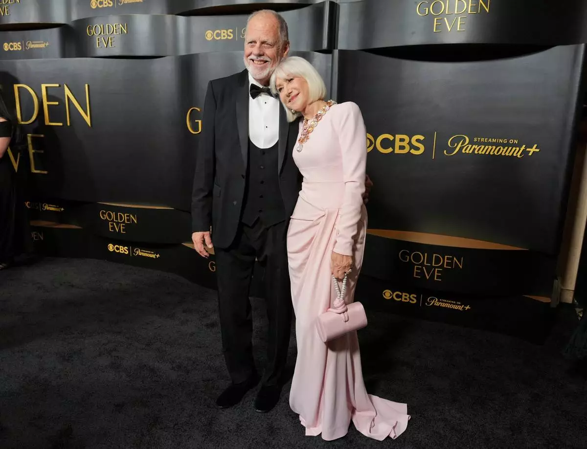 Taylor Hackford, left, and Helen Mirren arrive at the Golden Globes Golden Eve on Tuesday, Jan. 6, 2026, at The Beverly Hilton Hotel, in Beverly Hills, Calif. (Photo by Jordan Strauss/Invision/AP)