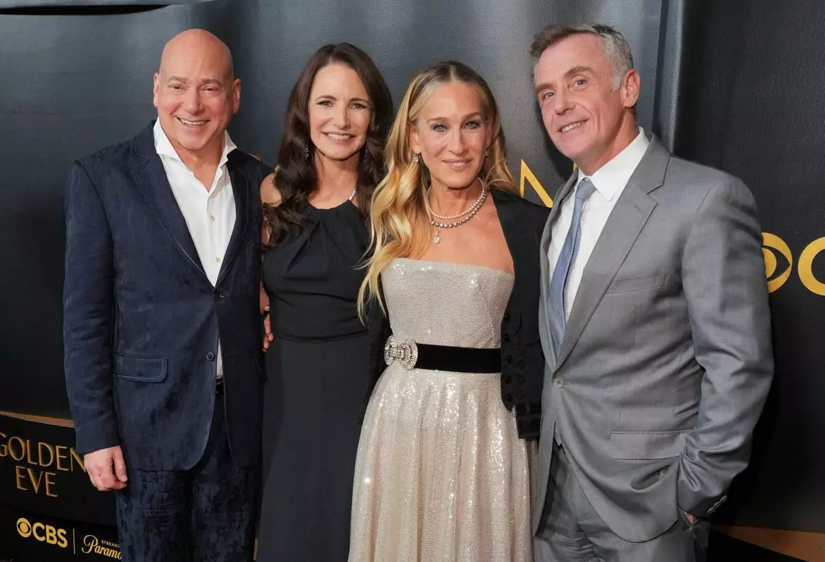 Evan Handler, from left, Kristin Davis, Sarah Jessica Parker and David Eigenberg arrive at the Golden Globes Golden Eve on Tuesday, Jan. 6, 2026, at The Beverly Hilton Hotel, in Beverly Hills, Calif. (Photo by Jordan Strauss/Invision/AP)