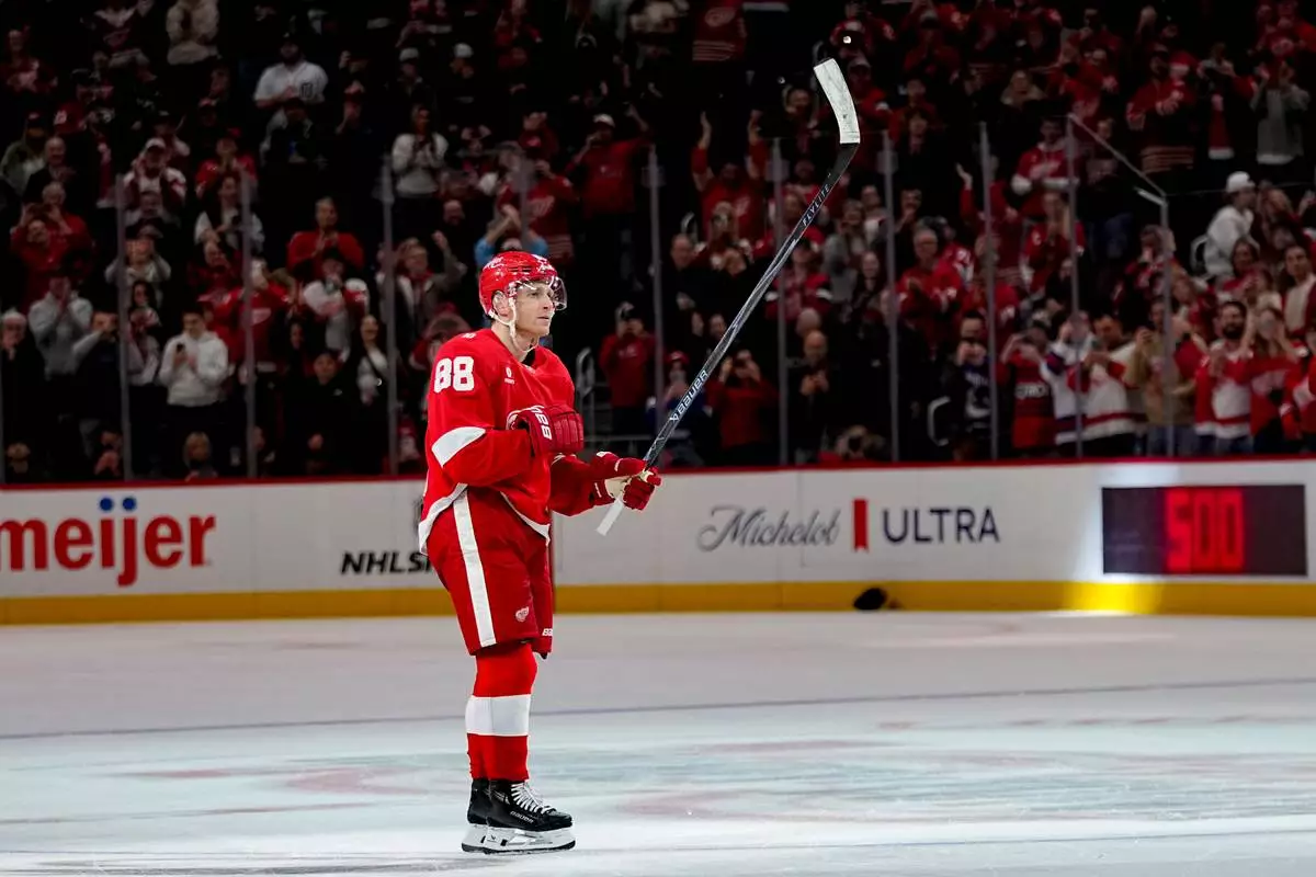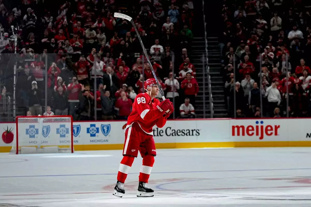 Detroit Red Wings right wing Patrick Kane greets fans after the team's win in NHL hockey game against the Vancouver Canucks after he scored his 500th career goal Thursday, Jan. 8, 2026, in Detroit. (AP Photo/Ryan Sun)