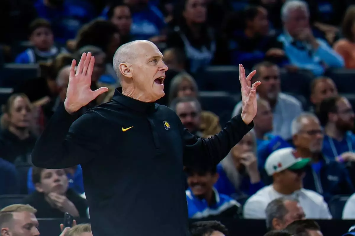 Indiana Pacers head coach Rick Carlisle reacts to his team as they play against the Orlando Magic during the first half of an NBA basketball game, Sunday, Jan. 4, 2026, in Orlando, Fla. (AP Photo/Kevin Kolczynski)