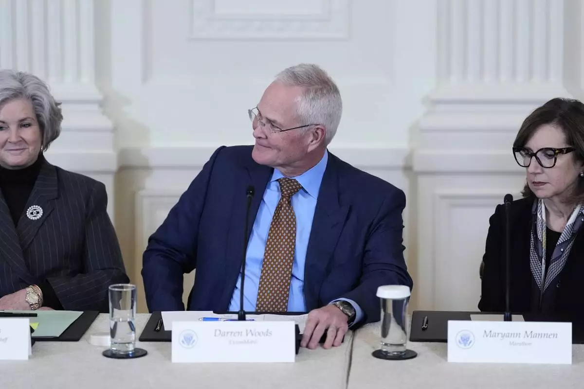 Chief Executive Officer and Chairman of ExxonMobil Darren Woods greets President Donald Trump, not pictured, with White House Chief of Staff Susie Wiles, seated left, and Chairman, President and Chief Executive Officer of Marathon Petroleum Maryann Mannen, seated right, during a meeting in the East Room of the White House, Friday, Jan. 9, 2026, in Washington. (AP Photo/Alex Brandon)
