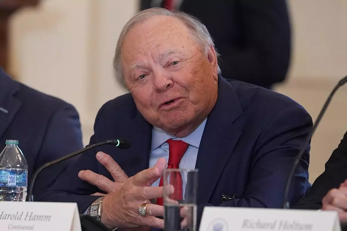 Harold Hamm, founder and chairman of Continental Resources, speaks during a meeting with President Donald Trump and oil executives in the East Room of the White House, Friday, Jan. 9, 2026, in Washington. (AP Photo/Evan Vucci)