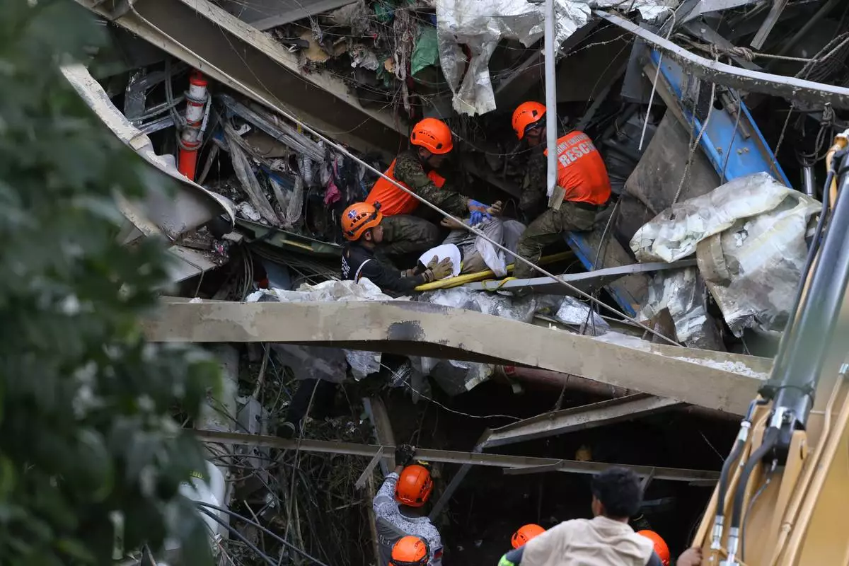 Rescuers retrieve a body inside a collapsed waste segregation facility in Binaliw, Cebu city, central Philippines on Friday, Jan. 9, 2026. (AP Photo/Jacqueline Hernandez)