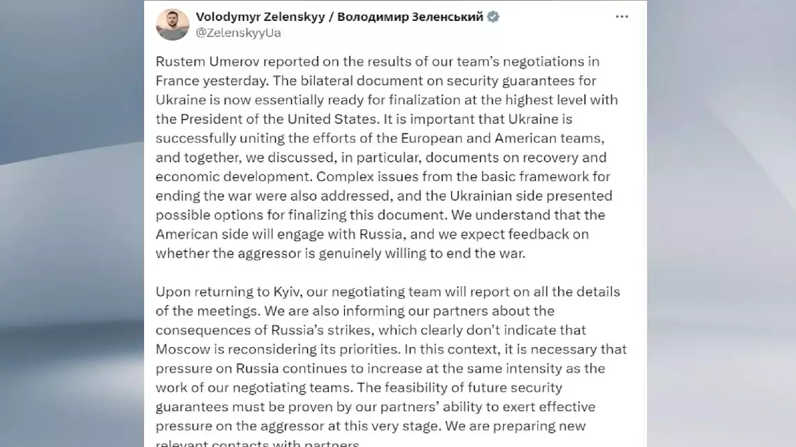 "The bilateral document on security guarantees for Ukraine is now essentially ready for finalization at the highest level with the President of the United States," Zelenskyy said on X after a conversation with Ukraine's top peace negotiator Rustem Umerov on the results of the peace talks in France.