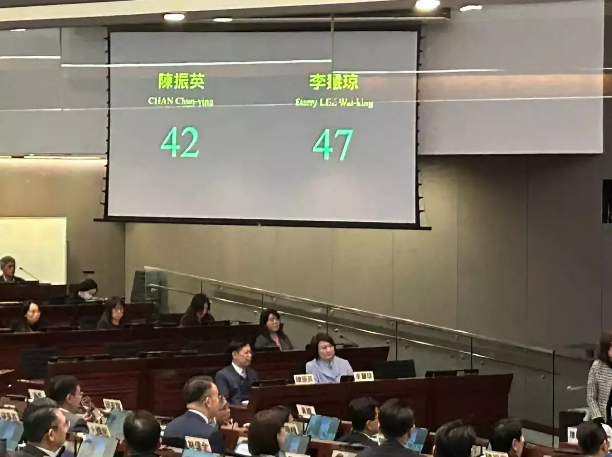 After the two candidates presented their platforms and answered questions from Members at the special forum, the election of the President began. The Members cast their votes by secret ballot. The Legislative Council Secretariat stated that a total of 89 ballots were received, and the votes were called on the spot. Among the Members, Dr. Hoey Simon Lee, the member of the Election Committee, was absent. After the ballot calling, the Secretariat counted the votes. Ultimately, Dr. Starry Lee received more than half the votes with 47, becoming the Legislative Council President, while Mr. Chan Chun-ying received 42 ballots. The two were only 5 votes apart.