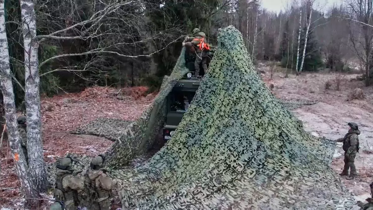 In this image made from video provided by Russian Defense Ministry Press Service on Monday, Dec. 29, 2025, Russian solders camouflage one of the trucks of the Russia's Oreshnik missile system with a net during training in an undisclosed location in Belarus. (Russian Defense Ministry Press Service via AP)