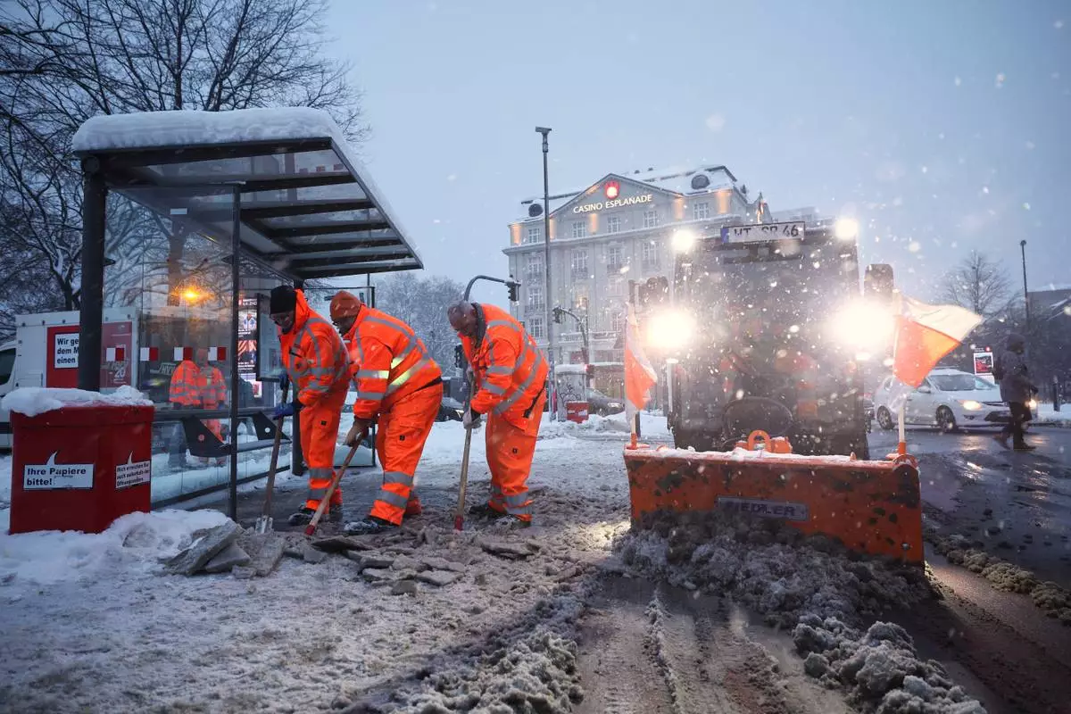 Hamburg municipal workers clear ice and snow from a bus stop at Stephansplatz, in Hamburg, Germany, Friday, Jan. 9, 2026. (Christian Charisius/dpa via AP)