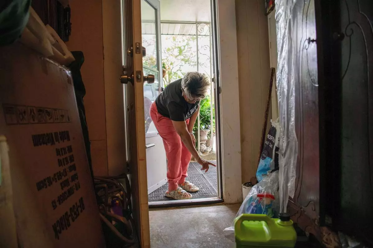 Yvette Lyles points to the spot on her wall reached by floodwaters in Cahokia Heights, Ill., May 15, 2025. (AP Photo/Michael Phillis)