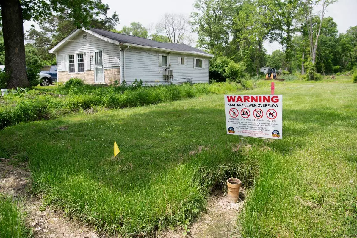 A sign warns of the dangers of sewer overflows in flood-prone Cahokia Heights, Ill., May 15, 2025. (AP Photo/Michael Phillis)