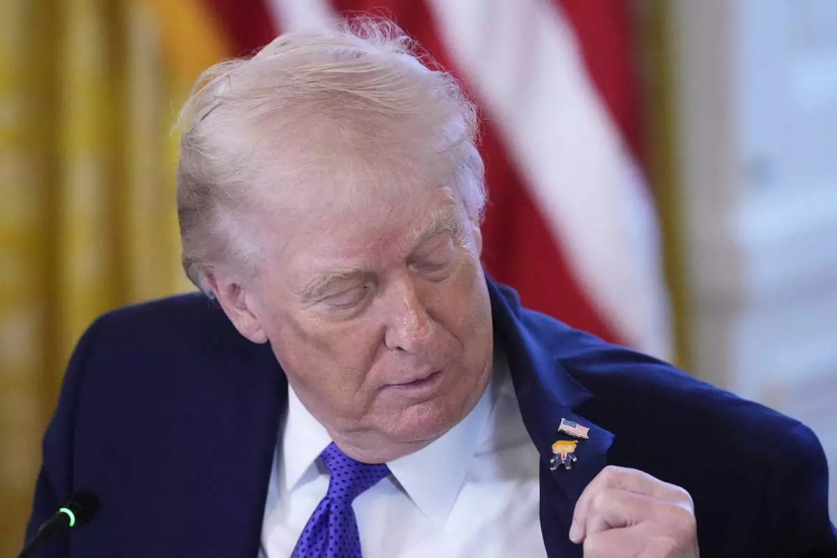 President Donald Trump wears a gift, which he calls a "Happy Trump" pin, during a meeting with oil executives in the East Room of the White House, Friday, Jan. 9, 2026, in Washington. (AP Photo/Alex Brandon)