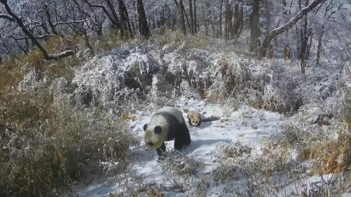 Infrared cameras in the Giant Panda National Park in southwest China's Sichuan Province captured footage of a wild giant panda mother and her cub roaming in a snowy bamboo forest on Thursday.