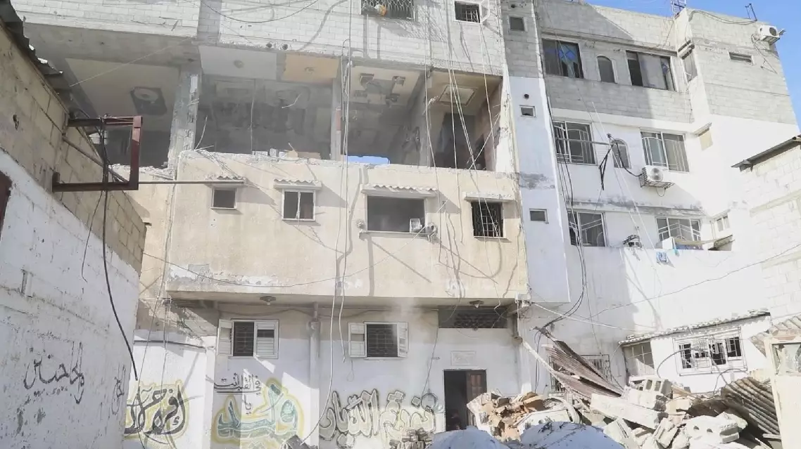 In the Nuseirat refugee camp in central Gaza, an apartment building was hit, resulting in massive destruction and injuries to several people, including a woman.