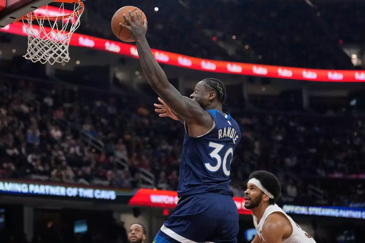 Minnesota Timberwolves forward Julius Randle (30) goes to the basket in front of Cleveland Cavaliers center Jarrett Allen, right, in the first half of an NBA basketball game Sunday, Jan. 4, 2026, in Cleveland. (AP Photo/Sue Ogrocki)