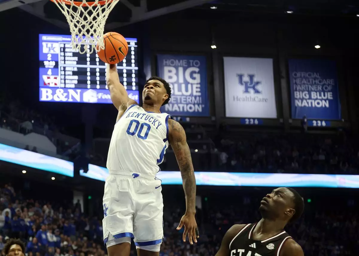 Kentucky's Otega Oweh (00) goes up to dunk as Mississippi State's Achor Achor, right, watches during the first half of an NCAA college basketball game in Lexington, Ky., Saturday, Jan. 10, 2026. (AP Photo/James Crisp)