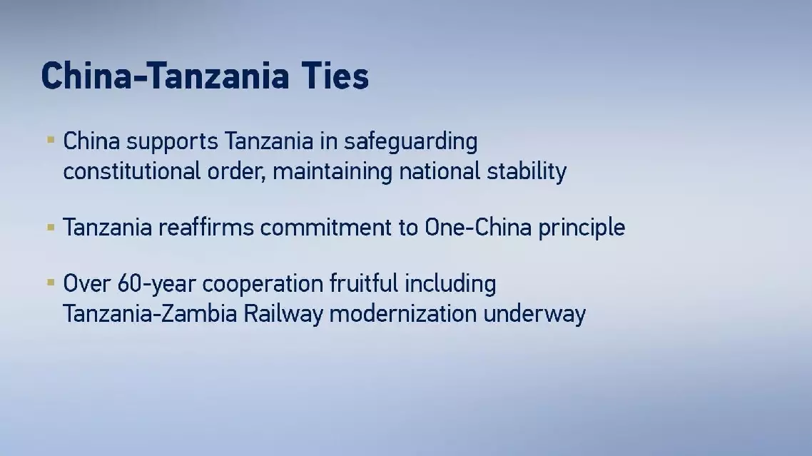China reiterated its full confidence in Tanzania's leadership and institutions to manage internal affairs independently, the communique said, while Tanzania reaffirmed its unwavering commitment to supporting the one-China principle and reiterated its consistent position of recognizing that there is but one China in the world and respecting China's national unity and territorial integrity, underscoring that any form of secession is unacceptable.