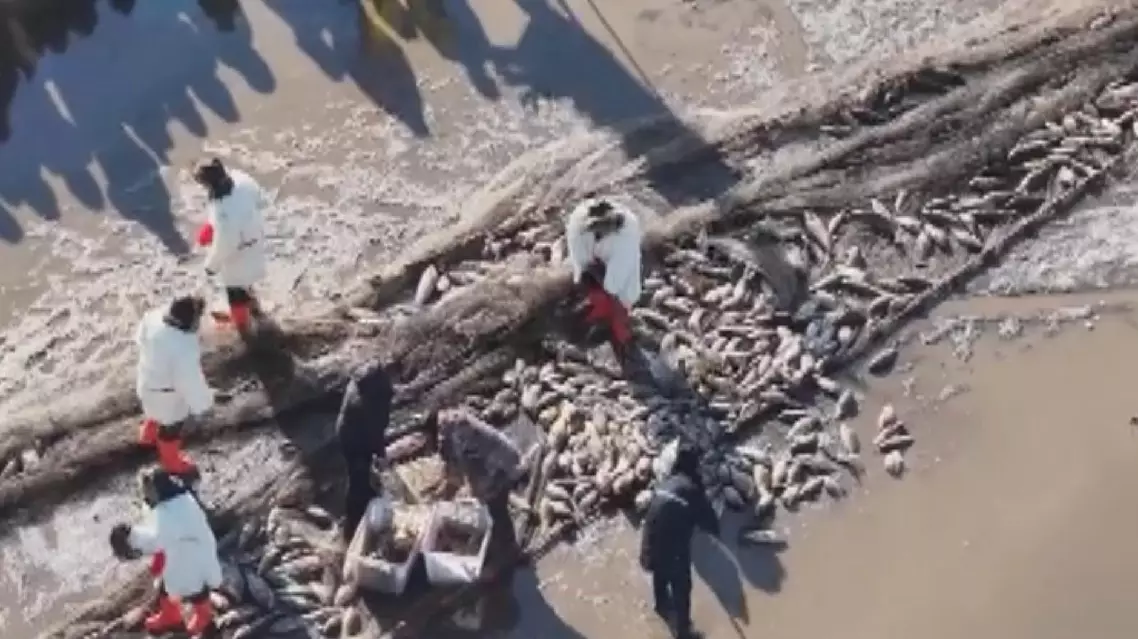 "The fishing net hasn't been fully pulled in yet, but over 20,000 jin (about 10,000 kg) can already be seen on the ice surface," said Yu Xinyuan, a fishing master.