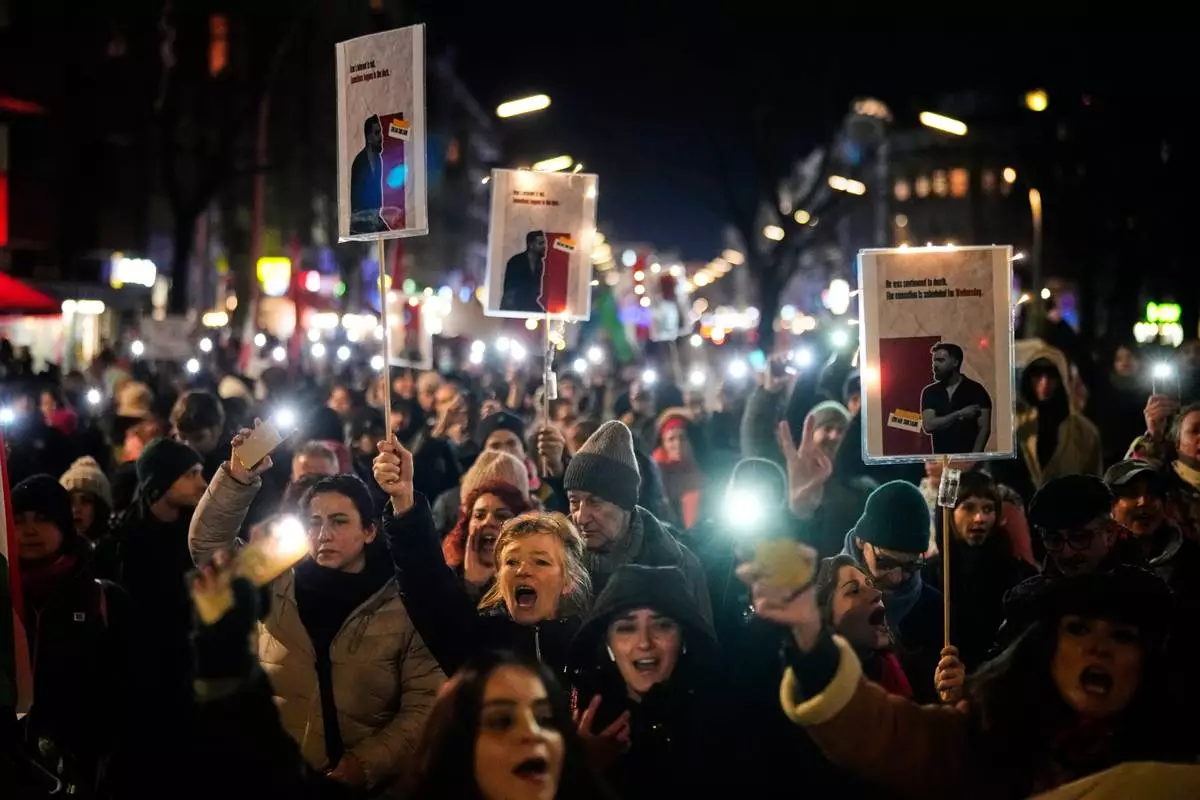 Protesters participate in a demonstration in Berlin, Germany, in support of the nationwide mass protests in Iran against the government, Saturday, Jan. 10, 2026. (AP Photo/Ebrahim Noroozi)