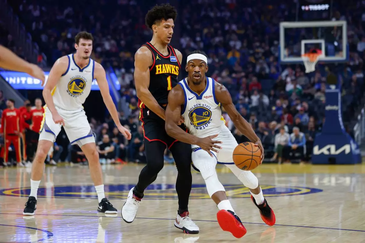Golden State Warriors Jimmy Butler III (10) dribbles the ball past Atlanta Hawks Jalen Johnson (1) during the first half an an NBA basketball game in San Francisco, Sunday, Jan. 11, 2026. (Carlos Avila Gonzalez/San Francisco Chronicle via AP)