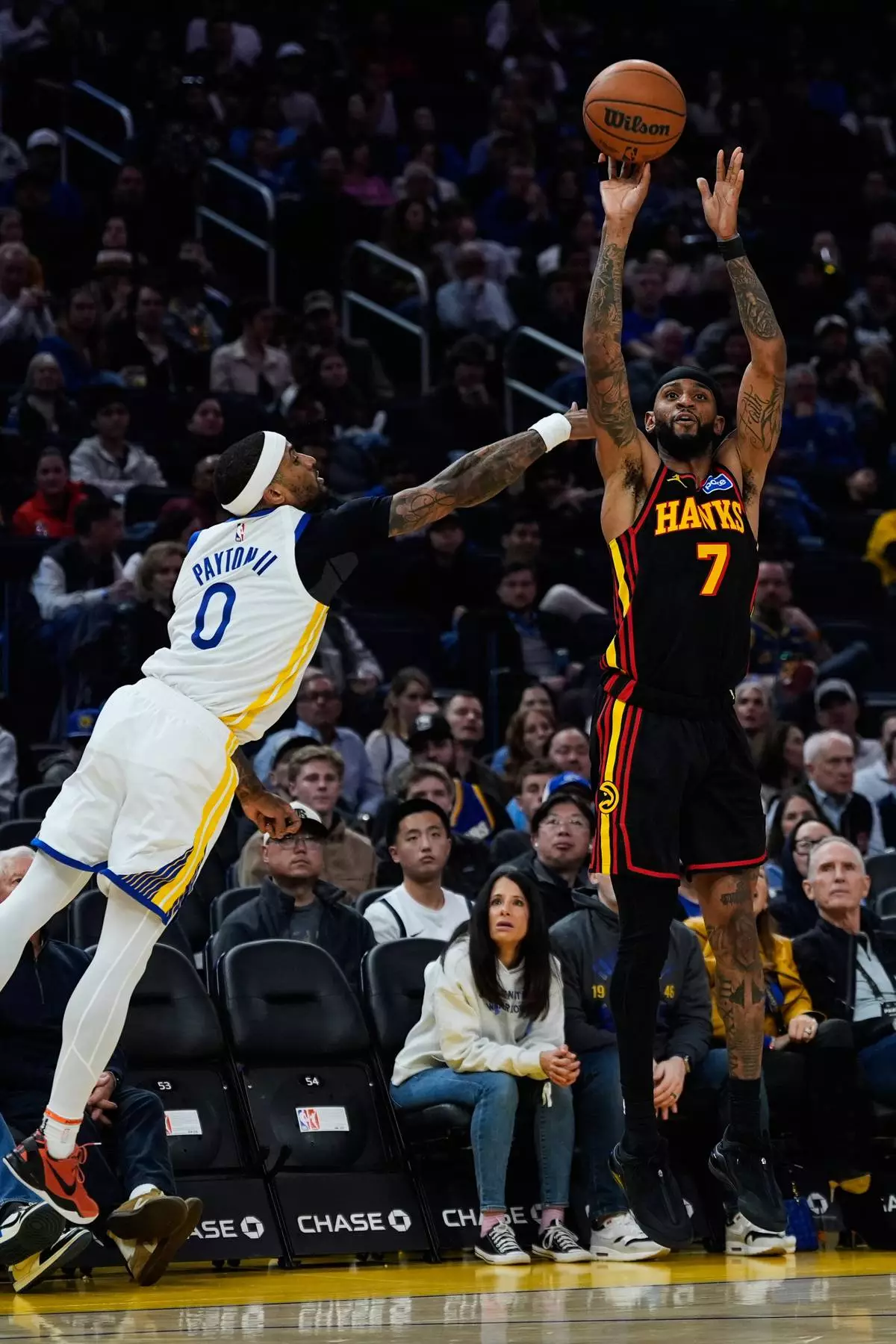 Atlanta Hawks guard Nickeil Alexander-Walker (7) shoots a 3-point basket next to Golden State Warriors guard Gary Payton II (0) during the first half of an NBA basketball game, Sunday, Jan. 11, 2026, in San Francisco. (AP Photo/Godofredo A. Vásquez)