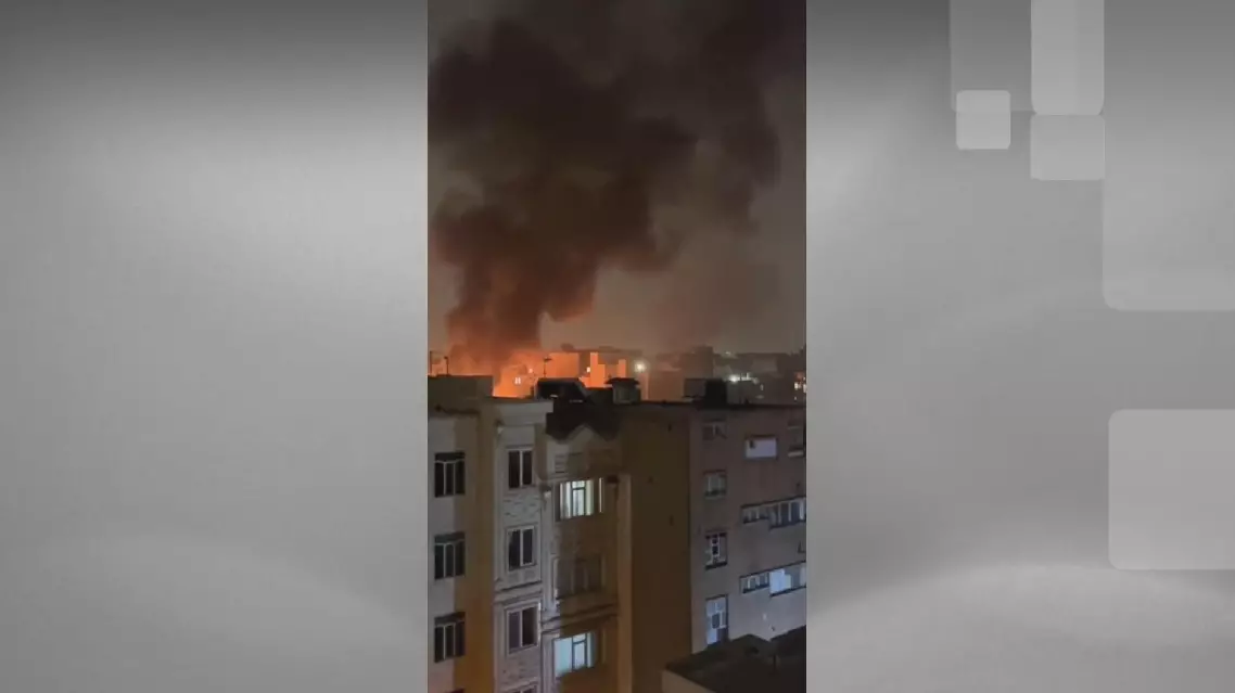 Footage from the China Media Group (CMG) filmed at the scene on Sunday shows large flames consuming buildings as well as charred remains of shops and a bank destroyed by shelling.