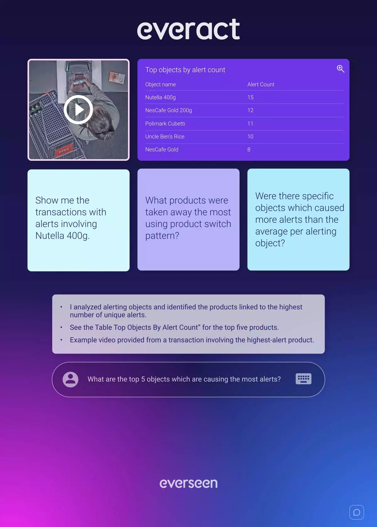 Everact shows top objects by alert count with video evidence of the highest-alert transaction