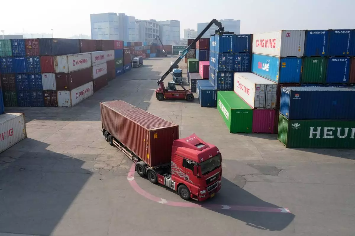 A truck runs by containers at the Uiwang ICD Terminal in Uiwang, South Korea, Thursday, March 12, 2026. (AP Photo/Ahn Young-joon)