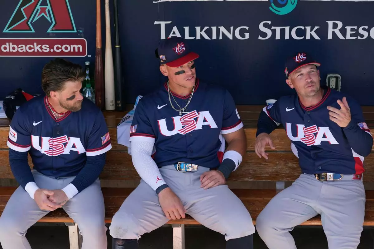 Uniteds States' Bryce Harper, left, Aaron Judge, center, and Alex Bregman sit in the team dugout prior to an exhibition baseball game against the Colorado Rockies Wednesday, March 4, 2026, in Scottsdale, Ariz. (AP Photo/Ross D. Franklin)