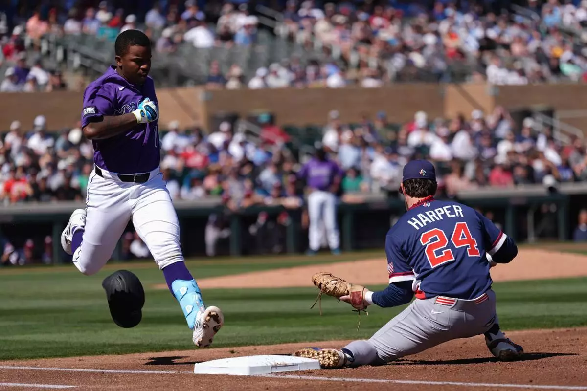 United States first baseman Bryce Harper (24) makes a catch at first base to get Colorado Rockies' Adael Amador, left, out during the first inning of an exhibition baseball game Wednesday, March 4, 2026, in Scottsdale, Ariz. (AP Photo/Ross D. Franklin)