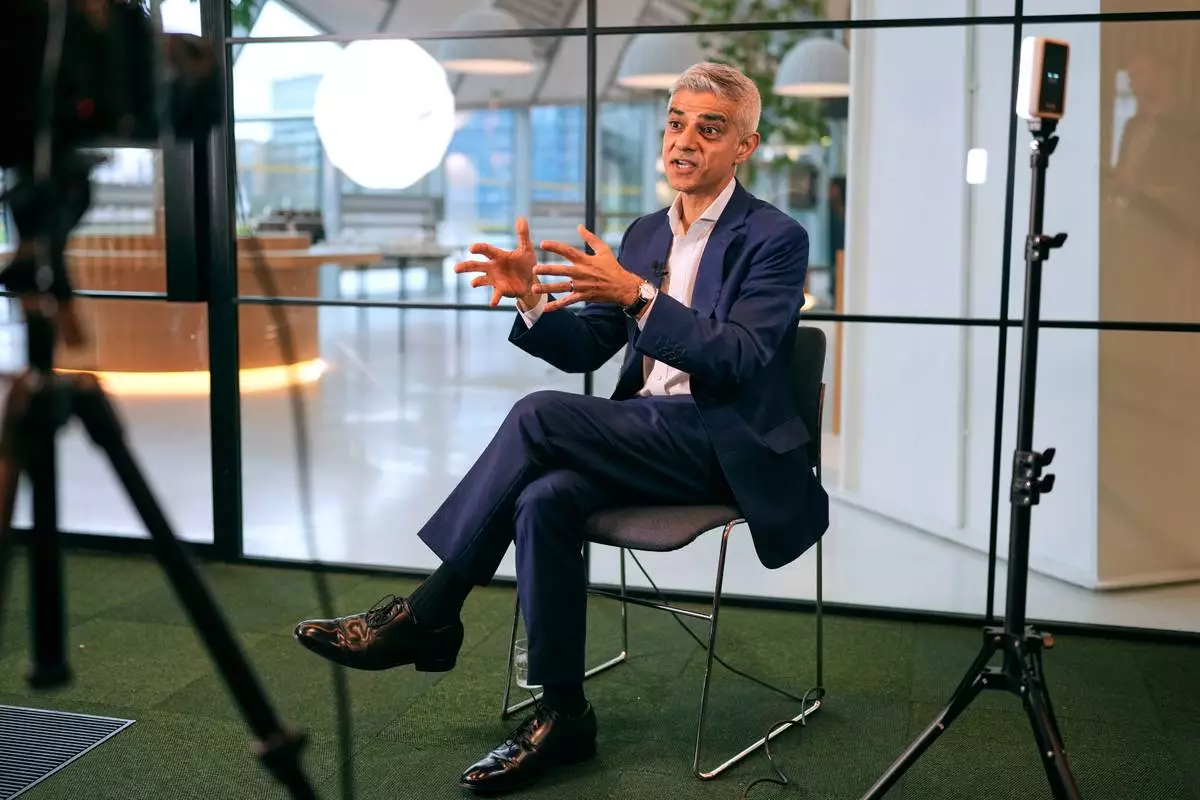Mayor of London Sadiq Khan speaks during an interview in London, Monday, Jan. 12, 2026. (AP Photo/Kirsty Wigglesworth)