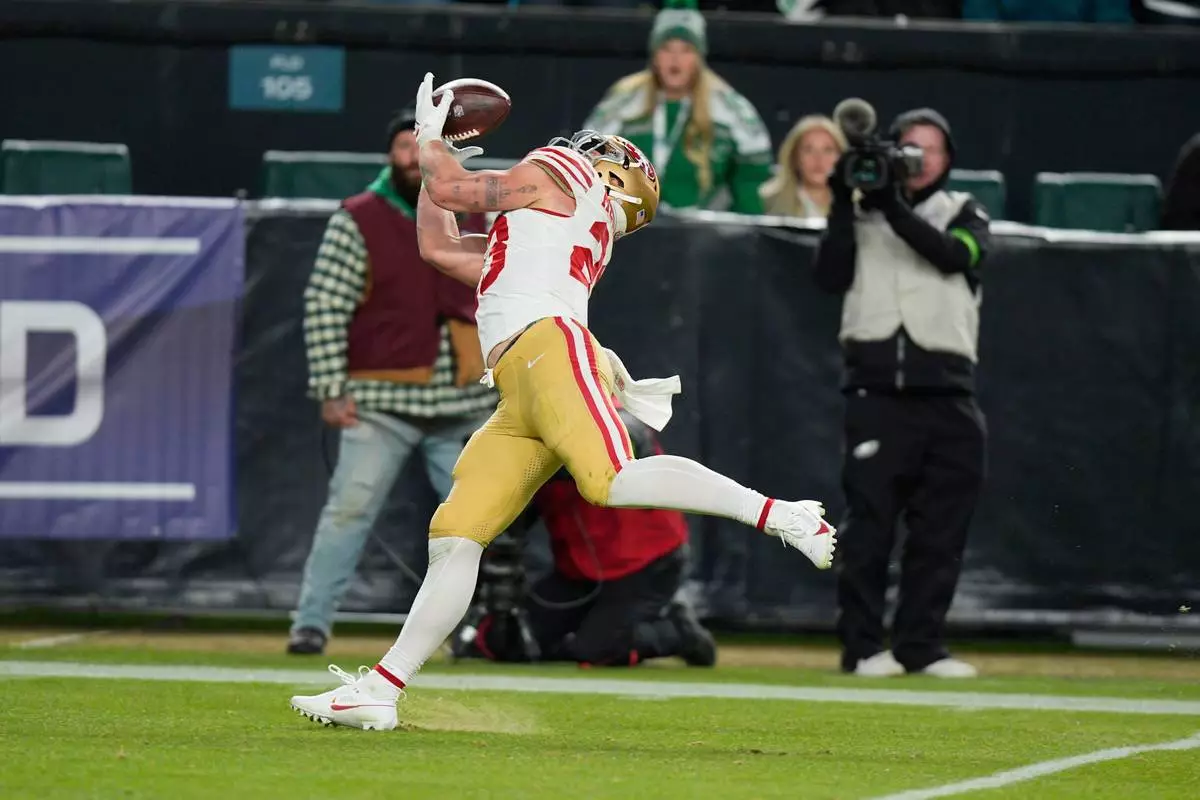 San Francisco 49ers running back Christian McCaffrey (23) catches a pass and scores a touchdown during the second half of an NFL wild-card playoff football game against the Philadelphia Eagles on Sunday, Jan. 11, 2026, in Philadelphia. (AP Photo/Chris Szagola)