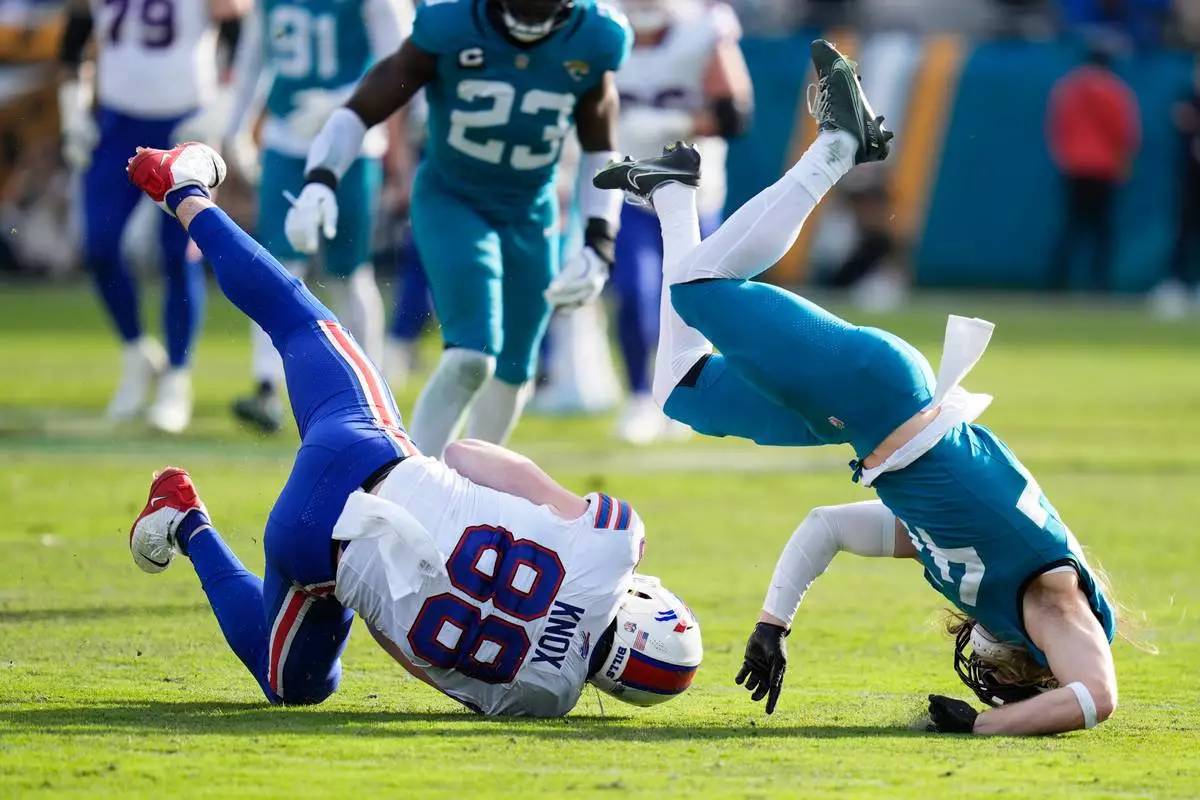 Jacksonville Jaguars safety Andrew Wingard, right, knocks down Jacksonville Jaguars tight end Patrick Herbert (88) after a reception during the second half of an NFL wild-card playoff football game Sunday, Jan. 11, 2026, in Jacksonville, Fla. (AP Photo/John Raoux)