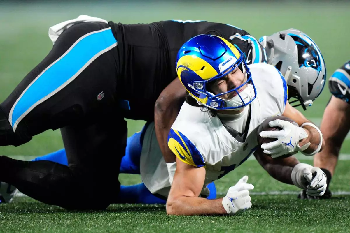 Los Angeles Rams wide receiver Puka Nacua, bottom, is tackled by Carolina Panthers defensive end Derrick Brown during the second half of an NFL wild-card playoff football game, Saturday, Jan. 10, 2026, in Charlotte, N.C. (AP Photo/Jacob Kupferman)