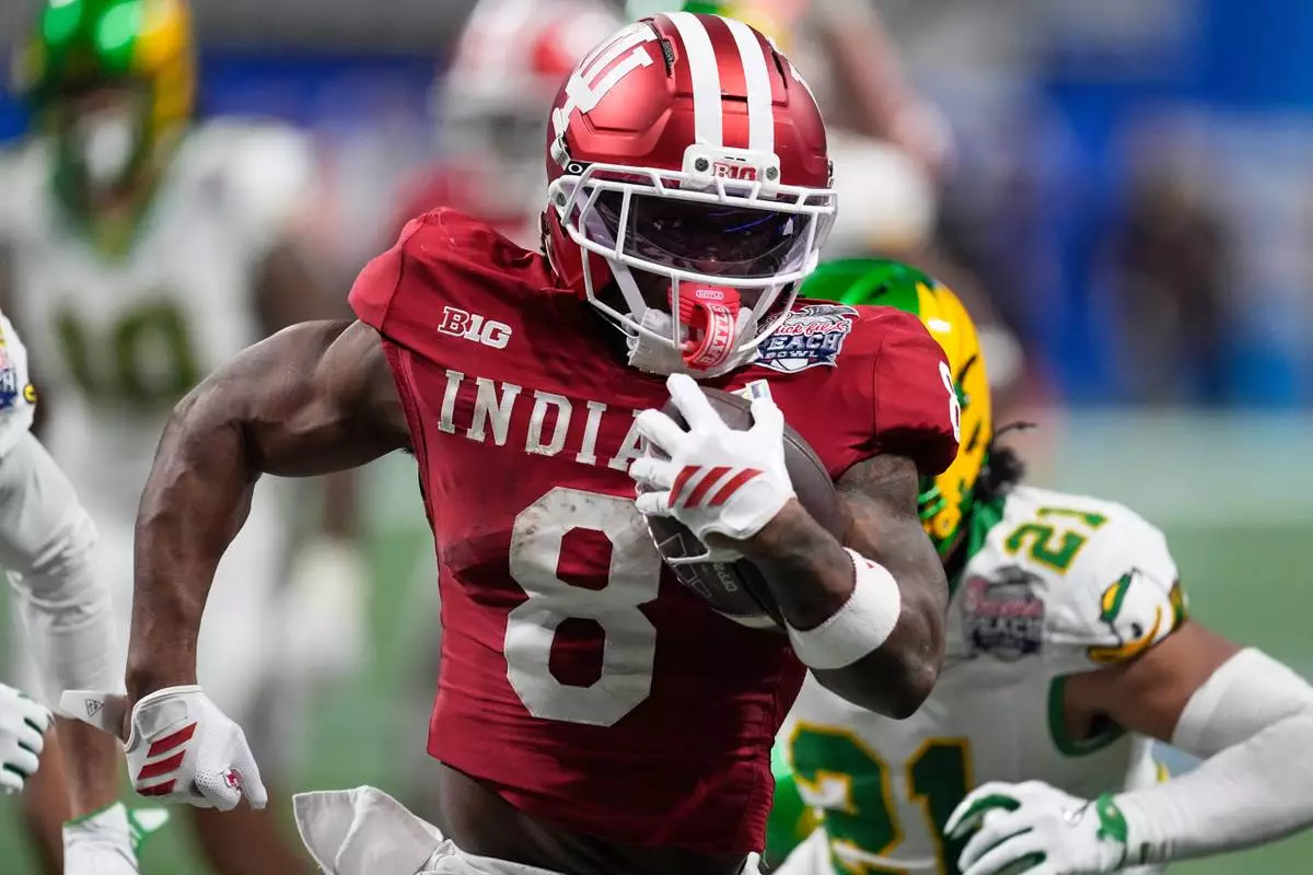 Indiana running back Kaelon Black (8) carries for a touchdown against Oregon during the second half of the Peach Bowl NCAA college football playoff semifinal, Friday, Jan. 9, 2026, in Atlanta. (AP Photo/Mike Stewart)