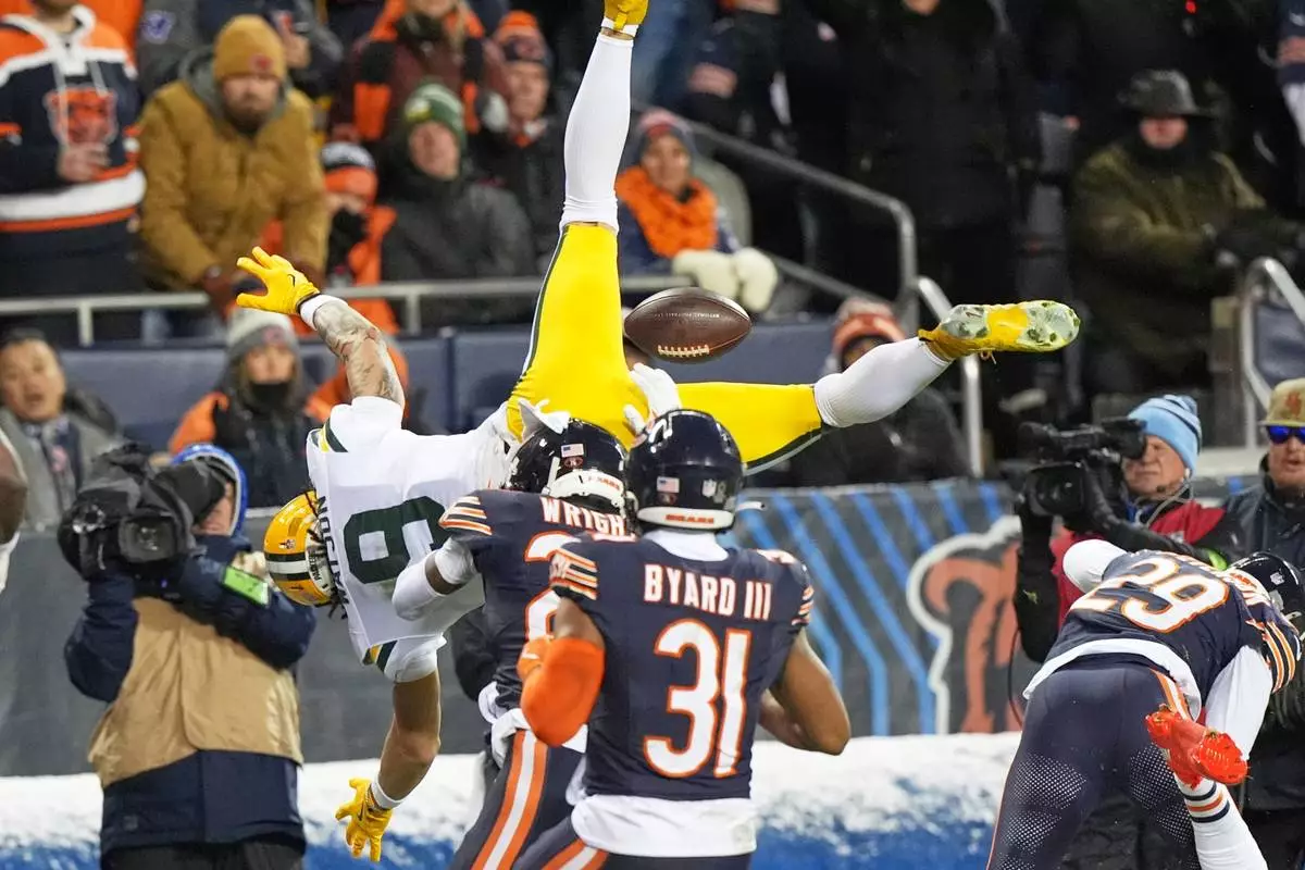 Green Bay Packers' Christian Watson loses the ball as he tries to leap into the endzone after a catch during the first half of an NFL wild-card playoff football game against the Chicago Bears Saturday, Jan. 10, 2026, in Chicago. (AP Photo/Nam Huh)
