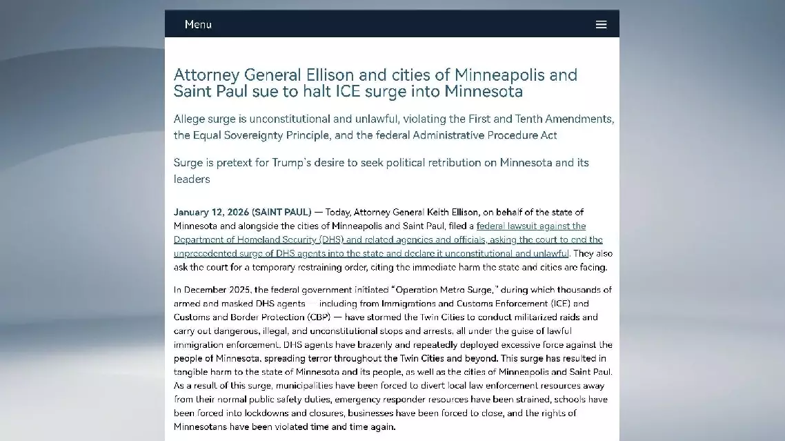The lawsuit, filed in the U.S. District Court for the District of Minnesota by Minnesota Attorney General Keith Ellison and officials from Minneapolis and St. Paul, alleges that an unprecedented deployment of federal immigration enforcement agents from multiple agencies within the U.S. Department of Homeland Security (DHS) has "instilled fear" among people living, working and visiting the cities.