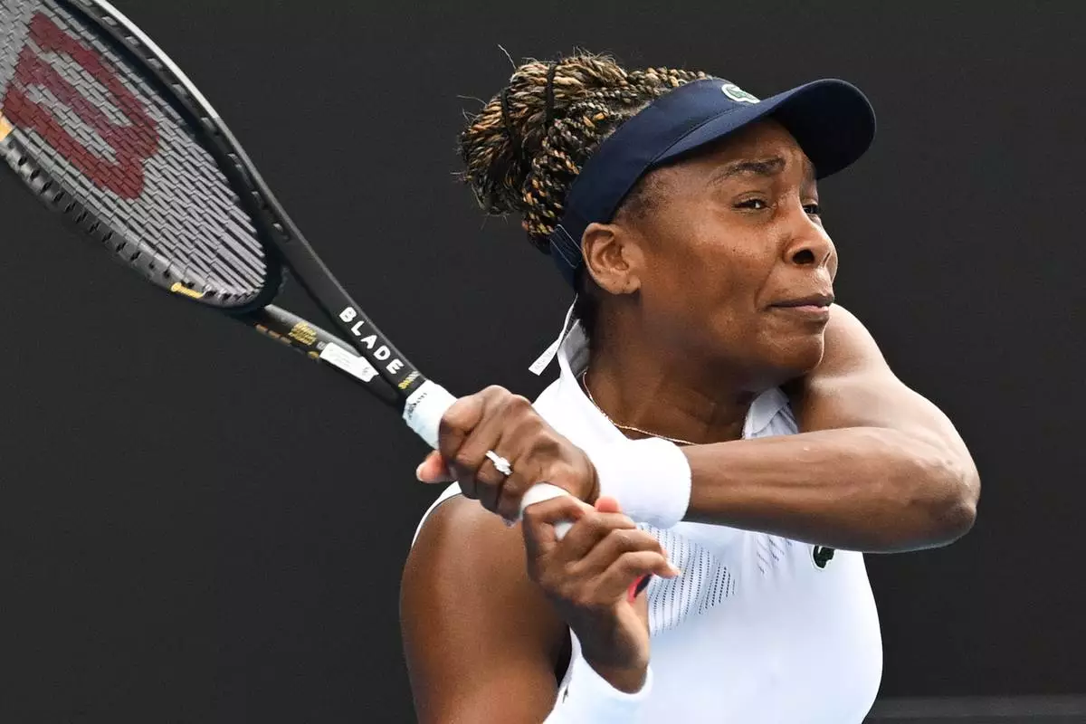 Venus Williams of the U.S. adjusts her visor while playing Magda Linette of Poland during their singles match at the ASB Classic Women's Tennis Tournament in, Auckland, New Zealand Tuesday, Jan. 6, 2026. (Andrew Cornaga/Photosport via AP)
