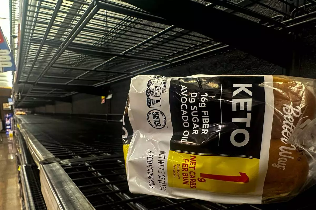 A loaf of bread sits on empty shelves in the bread isle in grocery store ahead of winter weather, Wednesday, Jan. 21, 2026, in Marietta, Ga. (AP Photo/Mike Stewart)