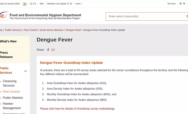 The Food and Environmental Hygiene Department (FEHD) today (January 13) released the first batch of gravidtrap indexes and density indexes for Aedes albopictus in January, covering 20 survey areas, as follows: