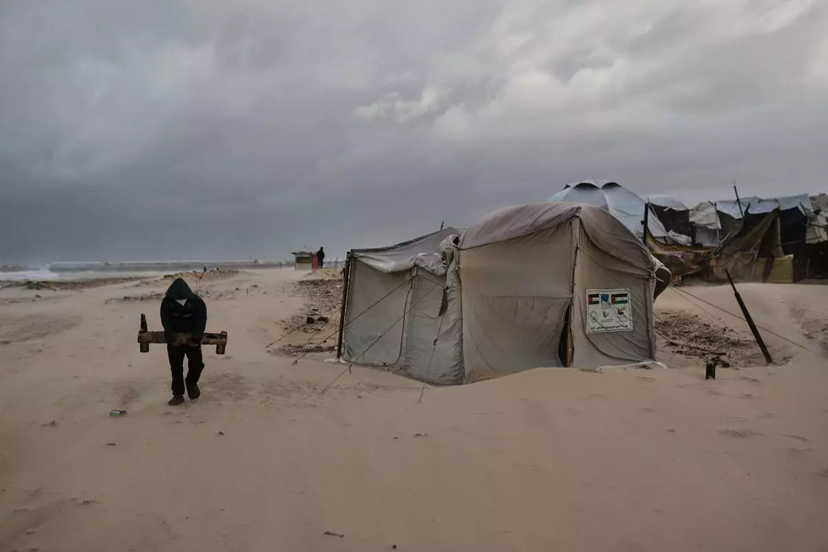 The majority of Palestinians live in makeshift tents since their homes were reduced to rubble during the war. When storms now strike the territory, Palestinian rescue workers warn people against seeking shelter inside damaged buildings, saying they could fall down on top of them.