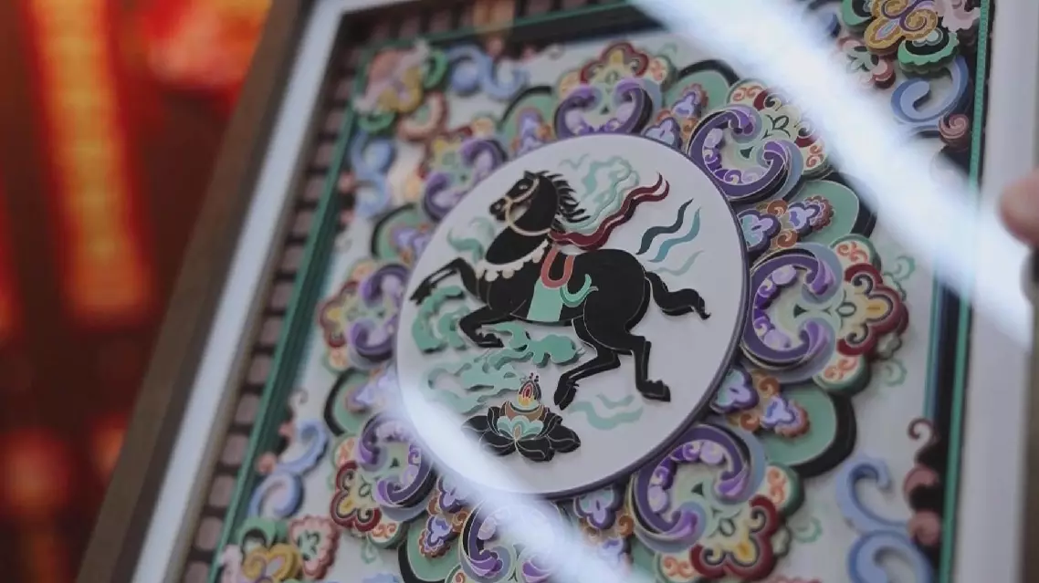 In east China's Yiwu City, a major hub for holiday goods, Year of the Horse-themed merchandise is in high demand. One standout product is a framed three-dimensional paper-cutting portrait, depicting a "Horse Stepping on Auspicious Clouds." Featuring colors inspired by ancient Buddhist art found in the grottoes of north-central China's Dunhuang, the product has been drawing buyers from both domestic and international markets.