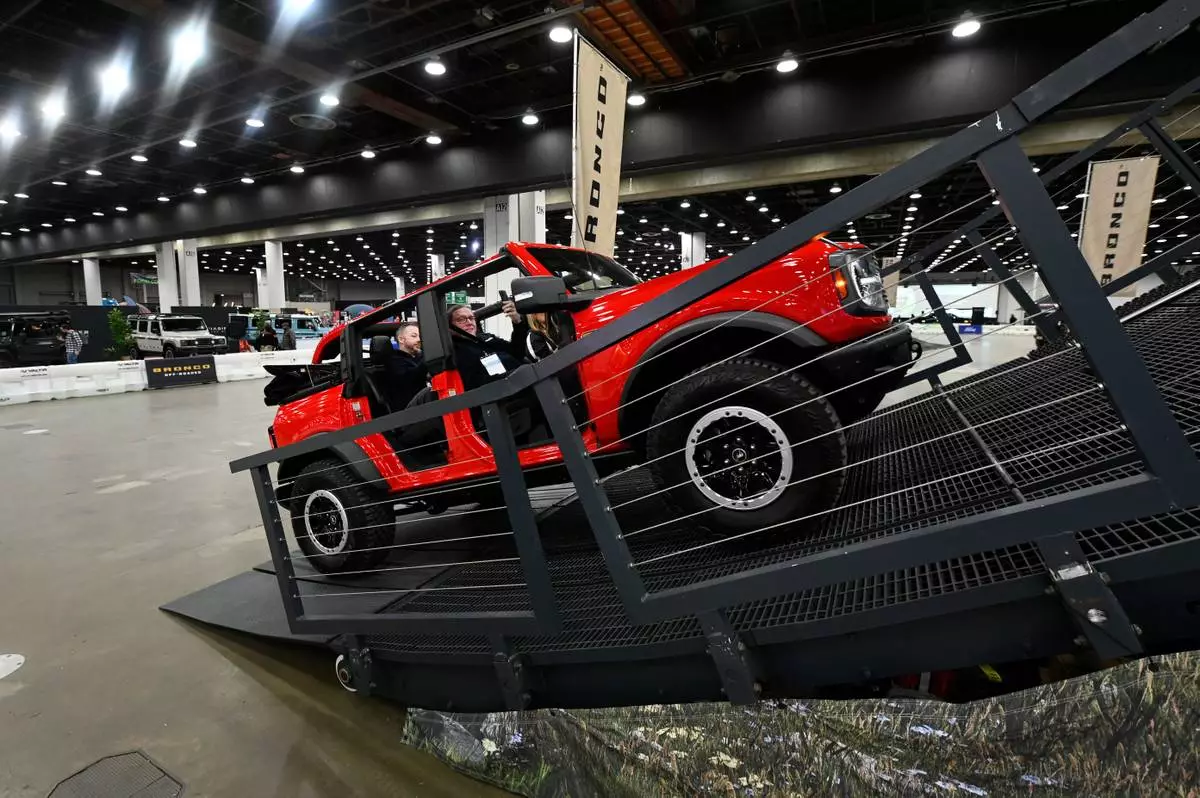 FILE - Guests are given a ride in a Bronco on a track at the Detroit Auto Show, Friday, Jan. 10, 2025, in Detroit. (AP Photo/Jose Juarez, file)