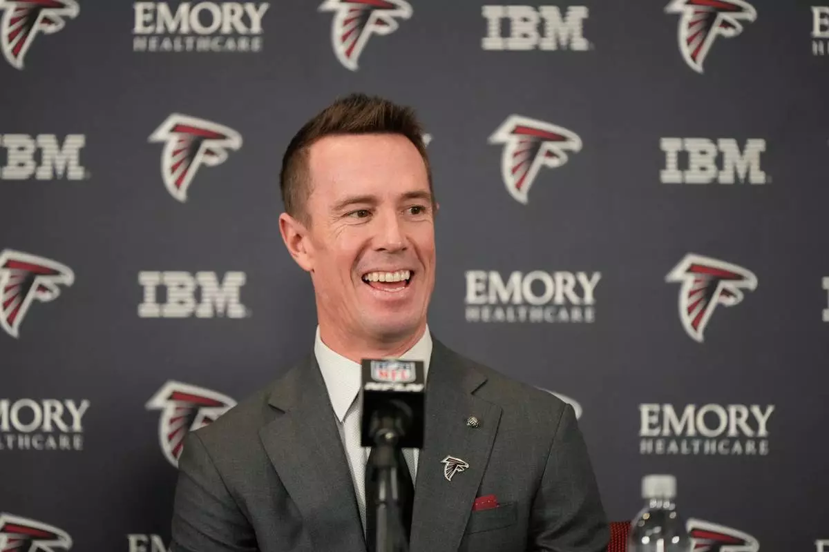 Former Falcons quarterback Matt Ryan speaks during a news conference as the new Atlanta Falcons president of football, along with Atlanta Falcons owner Arthur Blank, Tuesday, Jan. 13, 2026, in Flowery Branch, Ga. (AP Photo/Brynn Anderson)