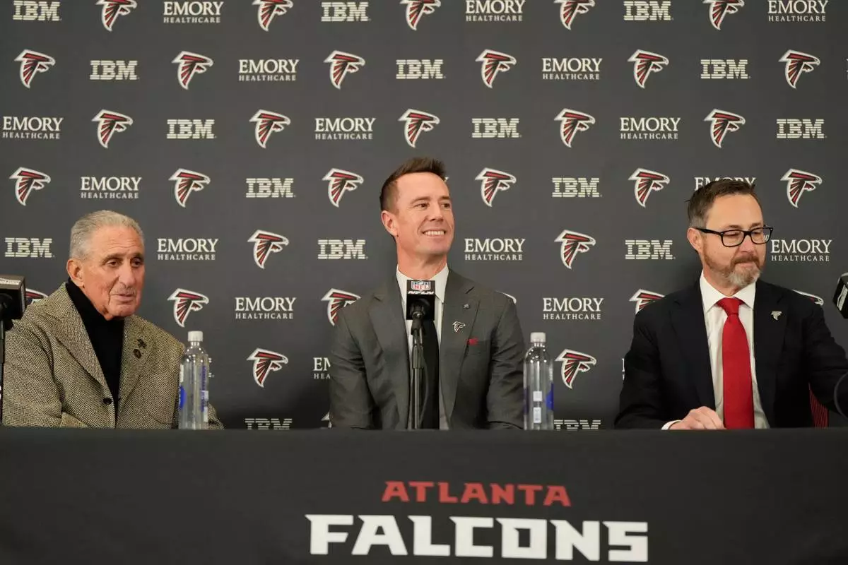 Former Falcons quarterback Matt Ryan speaks during a news conference as the new Atlanta Falcons president of football along with Atlanta Falcons owner Arthur Blank, left, and President and CEO of the Atlanta Falcons Greg Beadles, right, Tuesday, Jan. 13, 2026, in Flowery Branch, Ga. (AP Photo/Brynn Anderson)