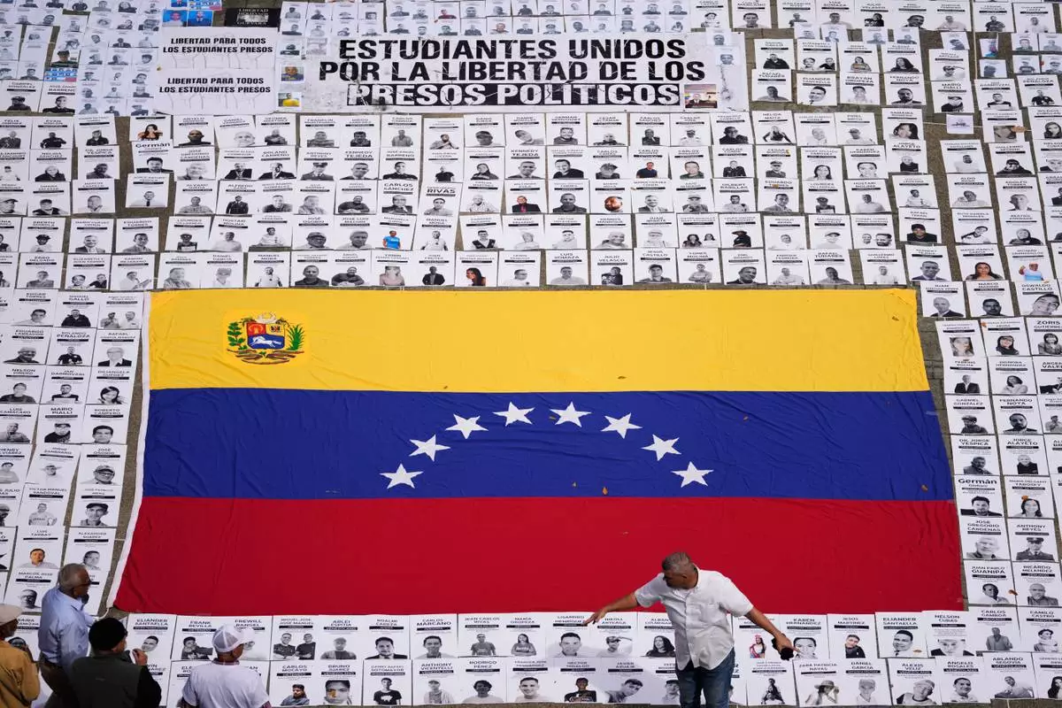 Students lay out photos of people they consider political prisoners at the Central University of Venezuela in Caracas, Venezuela, Tuesday, Jan. 13, 2026. (AP Photo/Matias Delacroix)