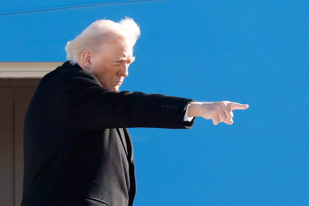 President Donald Trump points as he boards Air Force One for a trip to Detroit, Tuesday, Jan. 13, 2026, in Joint Base Andrews, Md. (AP Photo/Evan Vucci)