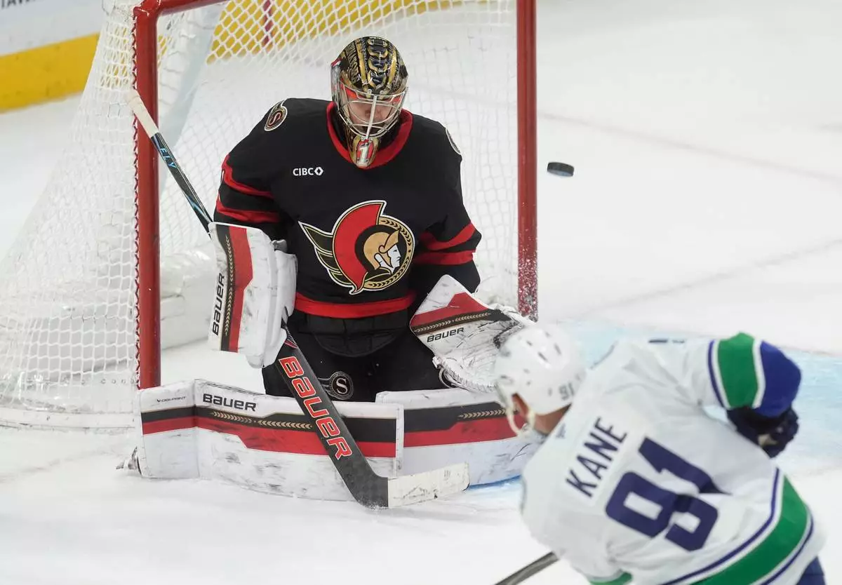Vancouver Canucks left wing Evander Kane (91) shoots the puck wide of the net past Ottawa Senators goaltender Leevi Merilainen (1) during second period NHL action in Ottawa, Tuesday, Jan. 13, 2026. (Adrian Wyld/The Canadian Press via AP)