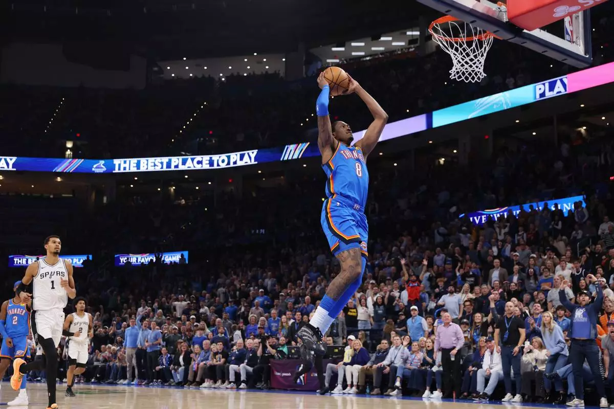 Oklahoma City won without two starters — top rebounder Isaiah Hartenstein and defensive stopper Lu Dort. The Thunder still held the Spurs to 40% shooting from the floor.