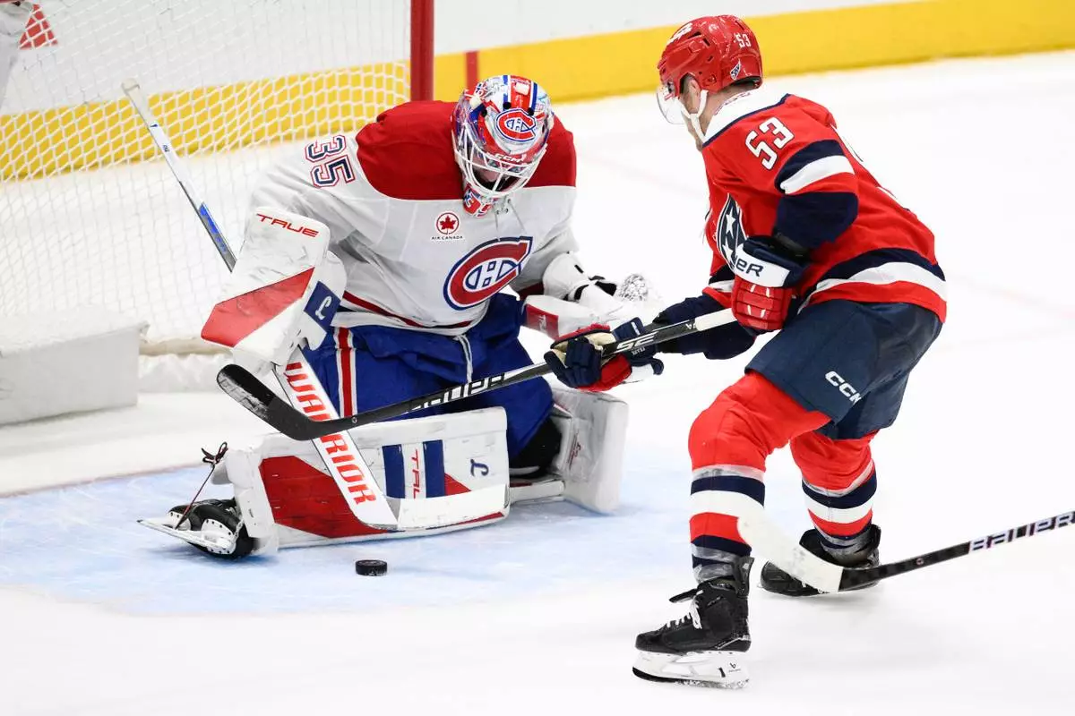 Montréal Canadiens goaltender Samuel Montembeault (35) stops the puck against Washington Capitals center Ethen Frank (53) during the overtime of an NHL hockey game, Tuesday, Jan. 13, 2026, in Washington. (AP Photo/Nick Wass)